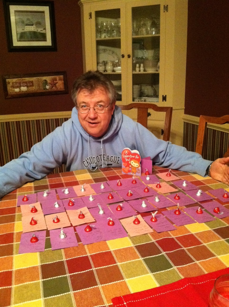 Well, here Kelly is with "38 kisses". My idea of showing him how much I care. Our first kiss ever was on Valentine's Day, 1975. So...38 years later...here we are. Thus, 38 kisses. Each paper had a memory of a kiss we had shared. Specific memories spanning the years. He enjoyed randomly picking one and turning it over to see the memory...and then we'd talk a little about it. Very fun, actually. The 38th was with a little kid valentine I had...the special kiss that represented THIS Valentine's Day. Afterwards...he said..."I thought we weren't doing anything". Oh well, it's ok. He rubbed my neck this morning at the crack of dawn because I had such a headache. He cooked dinner tonight because I worked late. He always tells me he loves me. It is really ok. I had fun doing the 38 kisses thing.